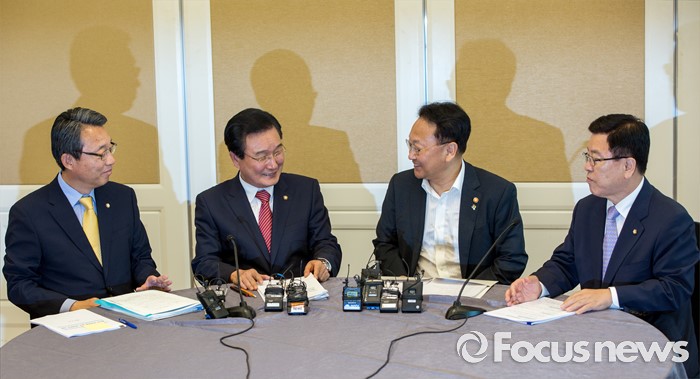 (서울=포커스뉴스) 16일 오후 서울 여의도 국회에서 열린 '2차 민생경제 현안점검회의'에 참석한 3당 정책위의장과 경제부총리가 회의 시작에 앞서 대화를 나누고 있다. 왼쪽부터 김성식 국민의당 정책위의장, 변재일 더불어민주당 정책위의장, 유일호 경제부총리 겸 기획재정부 장관, 김광림 새누리당 정책위의장.