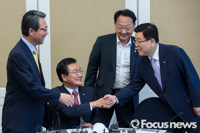 (서울=포커스뉴스) 변재일(왼쪽 두 번째) 더불어민주당 정책위의장과 김광림(오른쪽) 새누리당 정책위의장이 16일 오후 서울 여의도 국회에서 열린 '3당 정책위의장 2차 민생경제 현안점검회의'에 참석해 악수 하고 있다.