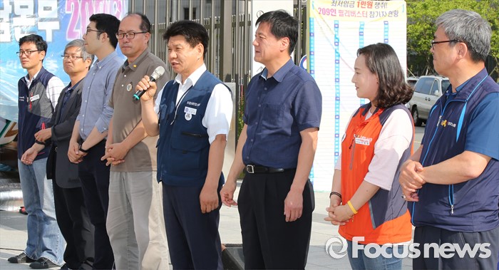 (세종=포커스뉴스) 민주노총 세종충남본부 조합원들이 16일 오후 정부세종청사 고용노동부 앞에서 최저임금 1만원 쟁취 집회에서 최저임금위원회 노동자위원들이 발언을 하고 있다. 이날 최저임금위원회 4차 전체회의가 열렸다.