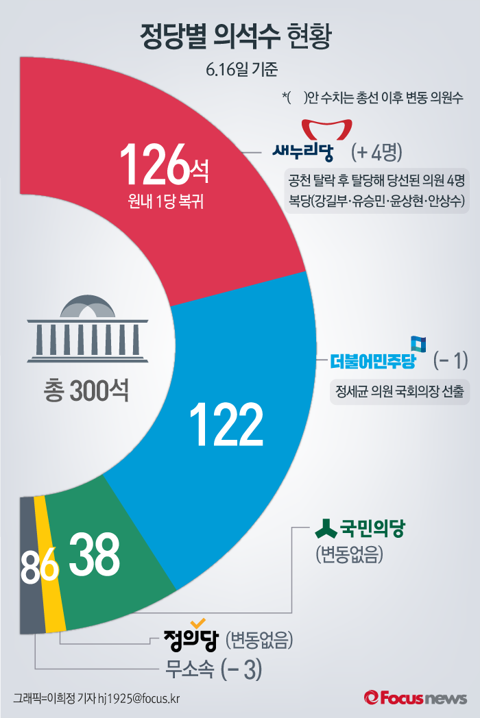 (서울=포커스뉴스) 원내 제2당이 됐던 새누리당이 16일 입당 의사를 밝힌 4인(유승민‧안상수‧윤상현‧강길부 의원)의 복당을 승인함에 따라 총 126석을 확보하며 원내에서 가장 의석수가 많은 정당이 됐다.