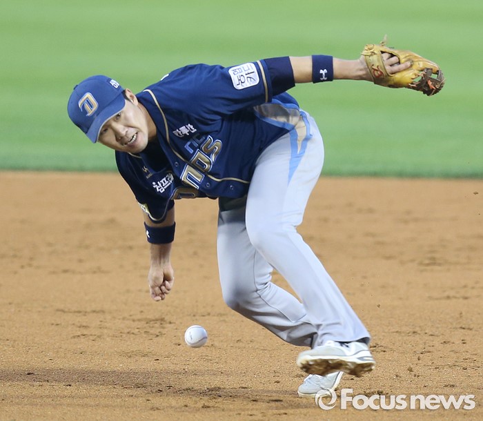 (서울=포커스뉴스) 16일 서울 잠실구장에서 열린 2016 프로야구 NC-LG 경기 5회말 2사후 NC 2루수 지석훈이 LG 대타 정주현의 투수 글러브를 스치는 타구를 잡으려다 놓치고 있다.
