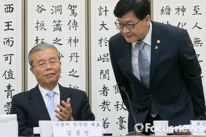 (서울=포커스뉴스) 17일 오전 서울 여의도 국회 귀빈식당에서 열린 국회 저출산극복 연구포럼 1차 회의에 참석한 정진엽 보건복지부 장관이 인사하고 있다. 왼쪽은 김종인 더불어민주당 비대위 대표.