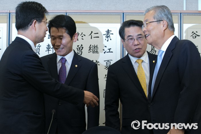 (서울=포커스뉴스) 17일 오전 서울 여의도 국회 귀빈식당에서 열린 국회 저출산극복 연구포럼 1차 회의에 참석한 김종인(오른쪽 첫번째) 더불어민주당 비대위 대표와 포럼 공동대표인 양승조(왼쪽 첫번째) 더민주 의원, 윤소하(왼쪽 두번째) 정의당 의원과 인사하고 있다.