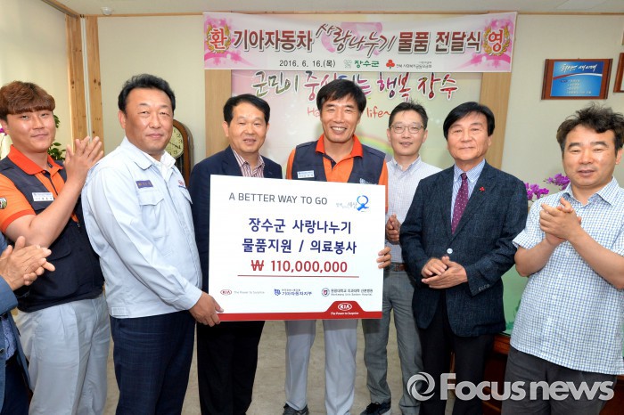 한편 기아차 노사는 매년 전국 각 지역을 찾아 어려운 이웃을 돕기 위한 나눔을 실천하고 있으며, 이 외에도 교통사고 유자녀 대상 ‘기아드림 장학금’ 지급, 복지시설 후원, 김장 봉사, 무료급식 봉사 등 다양한 사회공헌 및 봉사 활동을 지속적으로 펼치고 있다.16일 전라북도 장수군청에서 최준영 기아자동차 노무지원사업부장(보드 왼쪽), 김윤섭 장수군 부군수(보드 가운데), 김성락 기아자동차 노동조합 지부장(보드 오른쪽) 등이 참석한 가운데 기아자동차 노사가 지원물품 전달식을 가지고 기념촬영을 하는 모습. <사진제공=기아자동차>