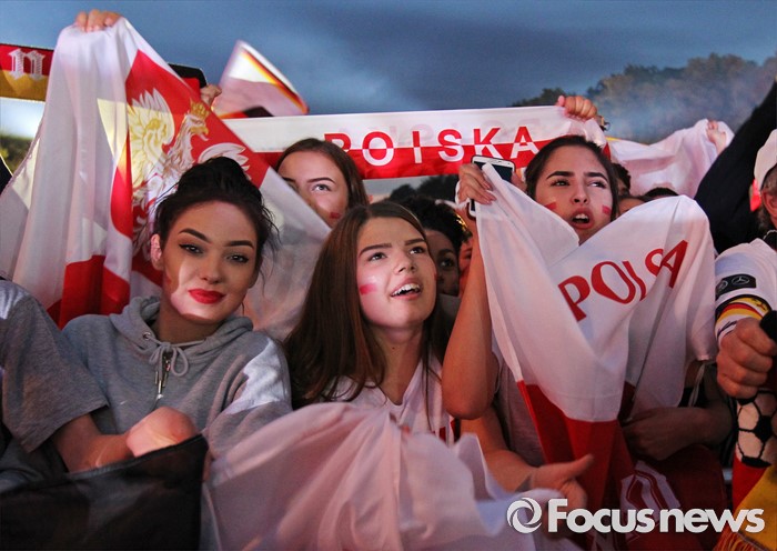 BERLIN, GERMANY - JUNE 16:Football fans of Poland watch the 2016 UEFA European Championship match between Germany and Poland at a public viewing area on a large outdoor screen at Brandenburg Gate on June 16, 2016 in Berlin, Germany.(Photo by Matthias Kern/Bongarts/Getty Images)