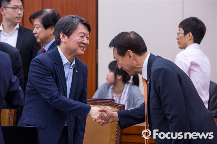 (서울=포커스뉴스) 안철수(왼쪽) 국회 교육문화체육관광위원회 위원과 이석기 위원이 17일 오전 서울 여의도 국회에서 열린 '교육문화체육관광위원회 전체회의'에 참석해 악수 하고 있다.