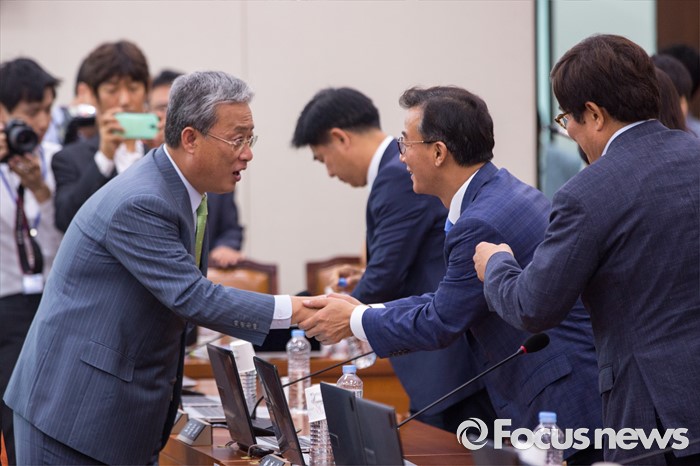 (서울=포커스뉴스) 유성엽(왼쪽) 국회 교육문화체육관광위원회 위원장이 17일 오전 서울 여의도 국회에서 열린 '교육문화체육관광위원회 전체회의'에 참석해 회의를 마친 뒤 위원들과 악수하고 있다.