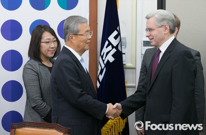 (서울=포커스뉴스) 김종인(왼쪽) 더불어민주당 비대위 대표가 17일 오전 서울 여의도 국회를 방문한 알렉산드로 티모닌 주한러시아대사와 면담에 앞서 인사하고 있다.
