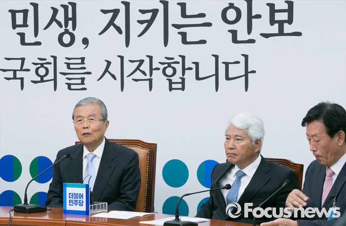 (서울=포커스뉴스) 김종인(왼쪽) 더불어민주당 비대위 대표가 17일 오전 서울 여의도 국회에서 열린 국방안보센터 창립회의에 참석해 인사말을 하고 있다. 가운데는 국방안보센터장으로 임명된 백군기 전 의원.