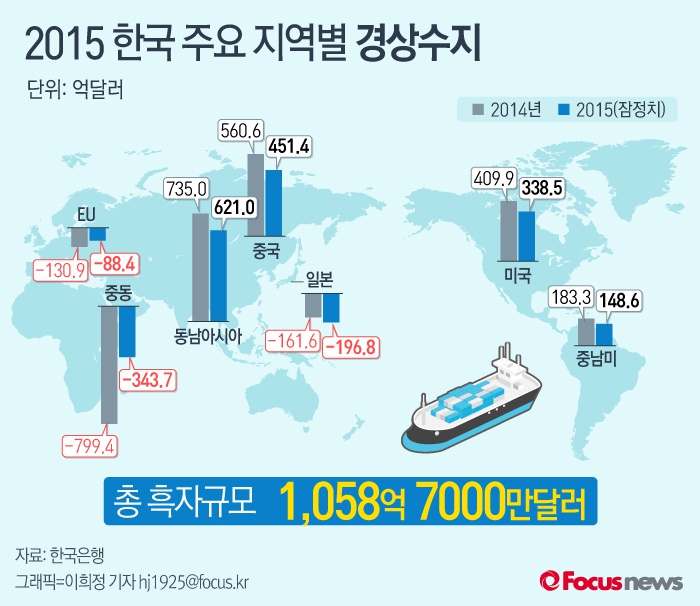 (서울=포커스뉴스) 17일 한국은행이 공개한 ‘2015년 중 지역별 국제수지(잠정)’를 보면 2015년 한국 경상수지 흑자규모는 1058억7000만달러로 나타났다. 2015년 한국은 미국과 중국, 중남미, 동남아시아와의 무역에서는 흑자를 봤으나 일본과 유럽연합(EU), 중동 무역에서 적자를 봤다 .