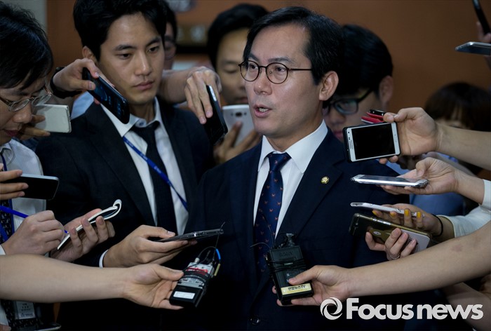 (서울=포커스뉴스) 김영우 새누리당 혁신비대위원이 17일 오전 서울 여의도 국회 정론관에서 전날 비대위 회의에서 논의된 탈당파 의원 일괄복당 결정과 관련 브리핑을 마친 뒤 취재진 질문에 답하고 있다.
