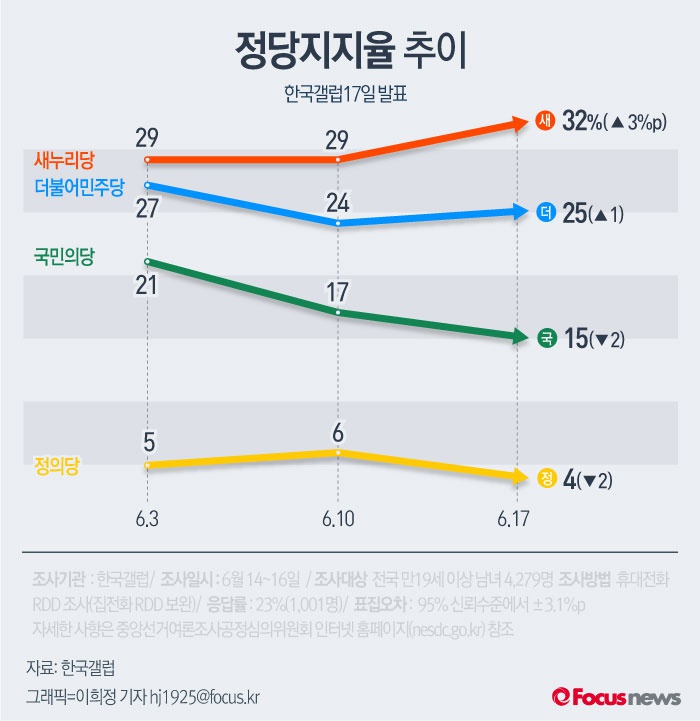 (서울=포커스뉴스) 한국갤럽이 17일 발표한 여론조사 결과에 따르면 새누리당의 지지율은 32%, 더불어민주당 25%, 국민의당 25%, 정의당 4% 순이었다.