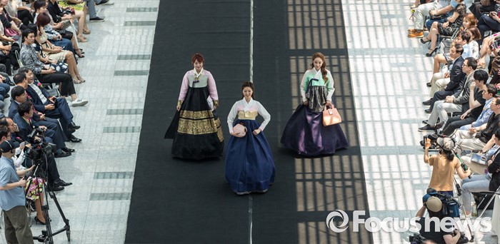(서울=포커스뉴스) 17일 오후 서울 여의도 국회의원회관에서 열린 '2016 대한민국 국회 초청패션쇼-품'에서 모델들이 개량한복을 입고 멋진 워킹을 선보이고 있다.