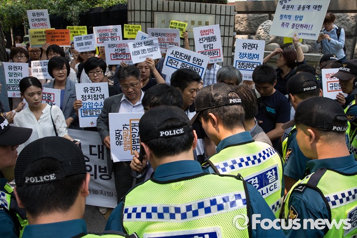 (서울=포커스뉴스) 17일 오후 서울 종로구 서울지방경찰청 앞에서 총선네트워크(총선넷) 회원들이 경찰 과잉수사 및 압수수색 규탄 기자회견에 앞서 자리문제로 경찰과 마찰을 빚고 있다.