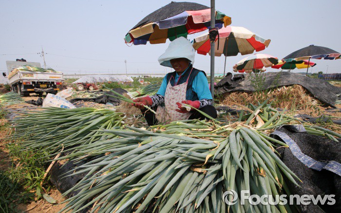 (청주=포커스뉴스) 최고기온이 30도가 넘으며 무더운 날씨를 보인 17일 오후 충북 청주시 흥덕구 들녘에서 농민들이 파를 수확하고 있다.