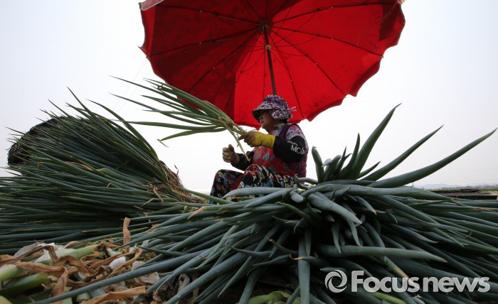 (청주=포커스뉴스) 최고기온이 30도가 넘으며 무더운 날씨를 보인 17일 오후 충북 청주시 흥덕구 들녘에서 농민들이 파를 수확하고 있다.
