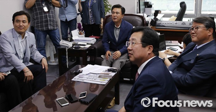 (서울=포커스뉴스) 17일 오후 서울 여의도 국회 의원회관 김태흠 새누리당 의원실에서 조원진, 이장우, 김태흠, 김진태 의원 등 친박계 의원들이 탈당파 복당 문제와 관련 논의를 하고 있다.
