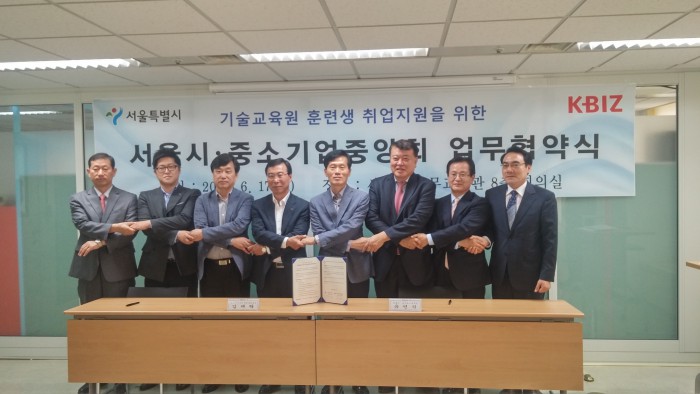 중기중아회는 17일 서울시와 '기술교육원 훈련생 중소기업 취업 지원을 위한 업무협약(MOU)'를 체결했다. 이번 MOU는 서울시에서 운영하는 4개 기술교육원(동부·중부·북부·남부) 훈련생의 중소기업 취업지원 강화와 신규 일자리사업 발굴을 목적으로 체결됐다.