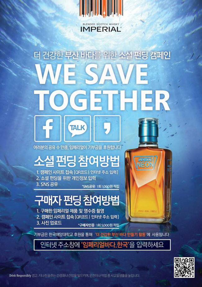 '위 세이브 투게더'는 국내 해양 환경 오염의 심각성을 알리고 해양 정화 운동의 참여를 독려하기 위해 마련된 로컬 위스키 최초의 기부형 소셜 펀딩이다. SNS(사회관계망서비스)를 통해 관련 게시물을 공유하거나 임페리얼 페이스북 페이지의 '좋아요'를 누르면 1건 당 1000원이 적립된다.