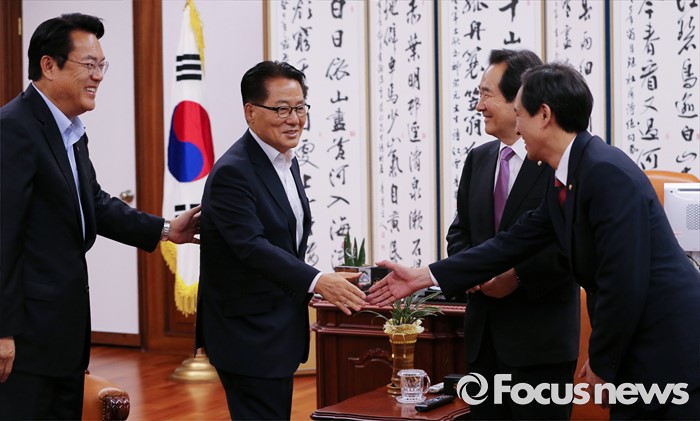 (서울=포커스뉴스) 정세균 국회의장이 17일 오후 서울 여의도 국회 의장집무실에서 3당 원내대표와 현안 논의를 위한 회동에 앞서 인사하고 있다. 왼쪽부터 정진석 새누리당 원내대표, 박지원 국민의당 원내대표, 정 의장, 우상호 더불어민주당 원내대표.