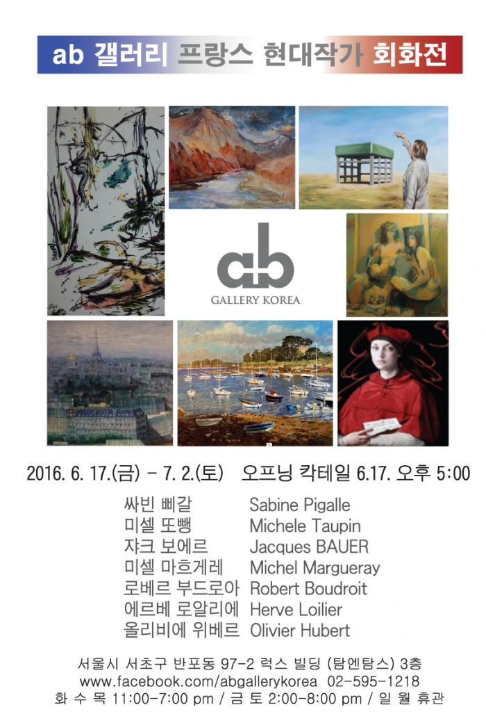 몽환적 형체의 구상화가 에르베 로알리에(Herve Loilier), 프랑스 노르망디와 파리 풍경화가 미셸 마흐게레(Michel Margueray), 풍경의 다양한 앵글과 황토빛 테마의 자끄 보에르(Jacques Bauer),일러스트레이터 특유의 극세밀화 테크닉의 올리비에 위베르(Olivier Hubert), 중세 초상화의 재해석이 흥미로운 사빈 삐갈(Sabine Pigall), 고유한 시공의 기억을 빛바랜 굵은 터치로 묘사하는 미셸 또뺑(Michele Taupin), 사실적 소재의 구조주의적 재해석 로베르 부드로와(Robert Boudroit)등 다채로운 프랑스 현대회화를 만날 수 있다.'프랑스현대작가회화전' 포스터.<사진제공=ab갤러리>