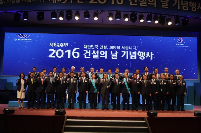 (서울=포커스뉴스) 강호인 국토교통부장관이 17일 건설의 날을 맞아 서울 강남구 건설회관에서 열린 2016 건설의 날 기념식에 참석해 참석자들과 기념촬영을 하고 있다. <사진제공=국토교통부>