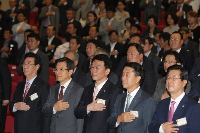(서울=포커스뉴스) 강호인(오른쪽 세 번째) 국토교통부장관이 17일 건설의 날을 맞아 서울 강남구 건설회관에서 열린 2016 건설의 날 기념식에 참석해 국기에 대한 경례를 하고 있다. <사진제공=국토교통부>