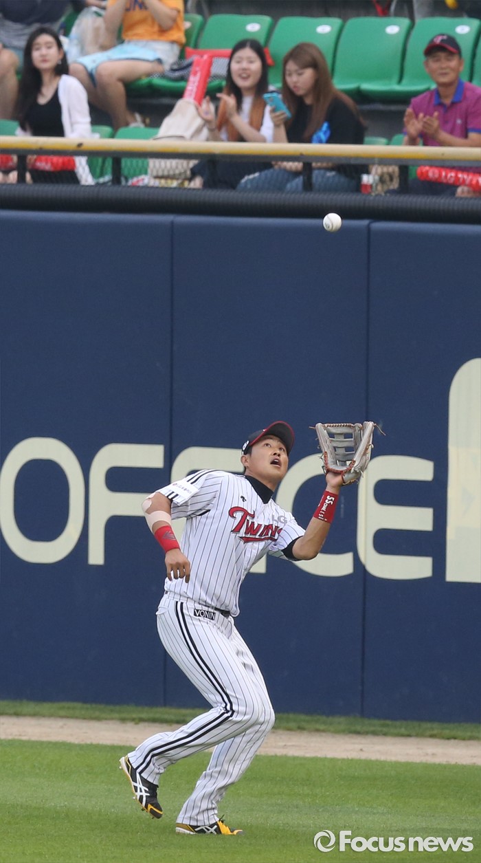 (서울=포커스뉴스) 17일 서울 잠실구장에서 열린 2016 프로야구 KIA-LG 경기에서 1회초 LG 좌익수 채은성이 KIA 김호령의 외야플라이볼을 잡고 있다.