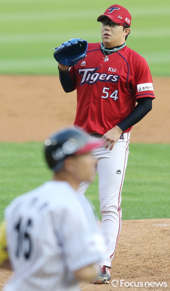(서울=포커스뉴스) 17일 서울 잠실구장에서 열린 2016 프로야구 KIA-LG 경기 1회말 1사후 KIA 투수 양현종이 LG 정성훈을 볼넷으로 진루시키고 있