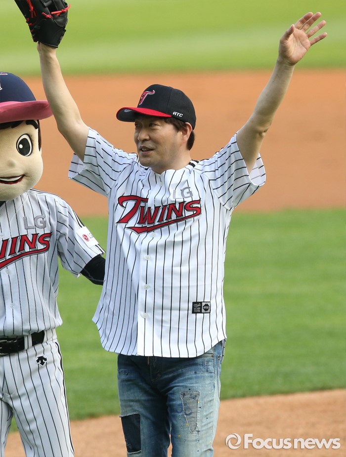 (서울=포커스뉴스) 17일 서울 잠실구장에서 열린 2016 프로야구 KIA-LG 경기에 앞서 배우 손현주가 시구를 마치고 팬들에게 손을 들어 인사하고 있다.