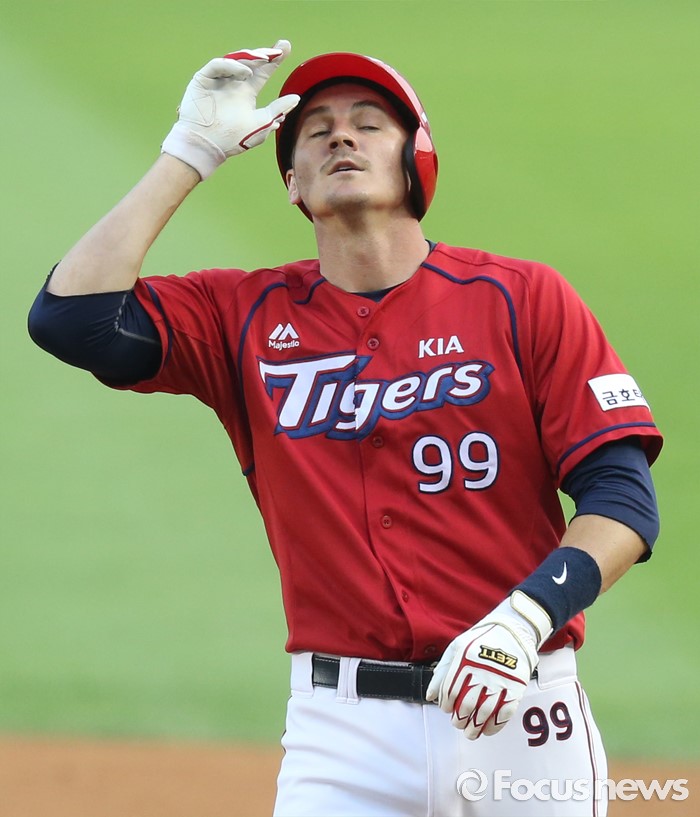 (서울=포커스뉴스) 17일 서울 잠실구장에서 열린 2016 프로야구 KIA-LG 경기 2회초 무사 1루에서 KIA 필이 우전 안타로 1루주자를 3루까지 보내고 1루에서 헬맷을 고쳐 쓰고 있다.