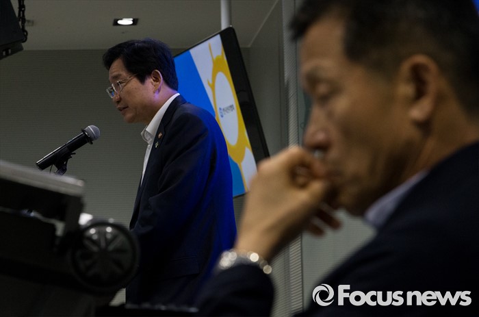 (양평=포커스뉴스) 17일 오후 경기 양평 강하면 블룸비스타에서 열린 2016년도 한국선주협회 사장단 연찬회에서 김영석(왼쪽) 해양수산부 장관이 축사를 하고 있다. 오른쪽은 김영무 한국선주협회 부회장.