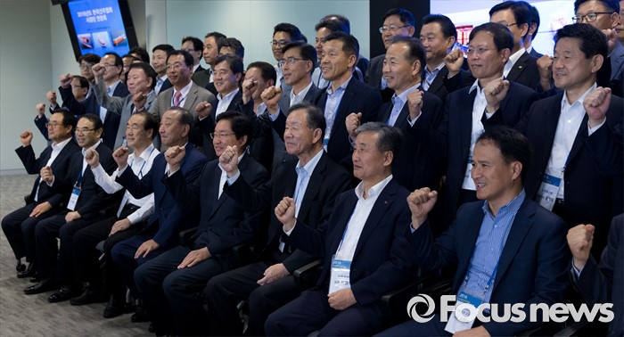 (양평=포커스뉴스) 17일 오후 경기 양평 강하면 블룸비스타에서 열린 2016년도 한국선주협회 사장단 연찬회에서 김영석 해양수산부 장관을 비롯한 참석자들이 파이팅을 외치며 기념촬영을 하고 있다.