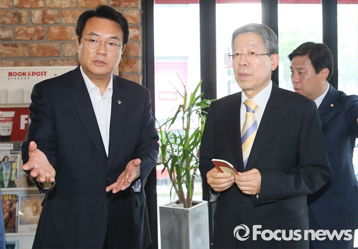 (서울=포커스뉴스) 김희옥 새누리당 혁신비상대책위원장과 정진석 원내대표가 19일 오전 서울 강남구 논현동 한 카페에서 비상대책위원회 정상화를 위한 회동을 하고 있다. 이번 회동은 지난 16일 탈당 무소속 의원들의 일괄복당을 결정한 혁신비대위 회의 과정에 불만을 제기하고 김 위원장이 칩거에 들어간지 나흘째 전격적으로 이뤄진 회동이다.