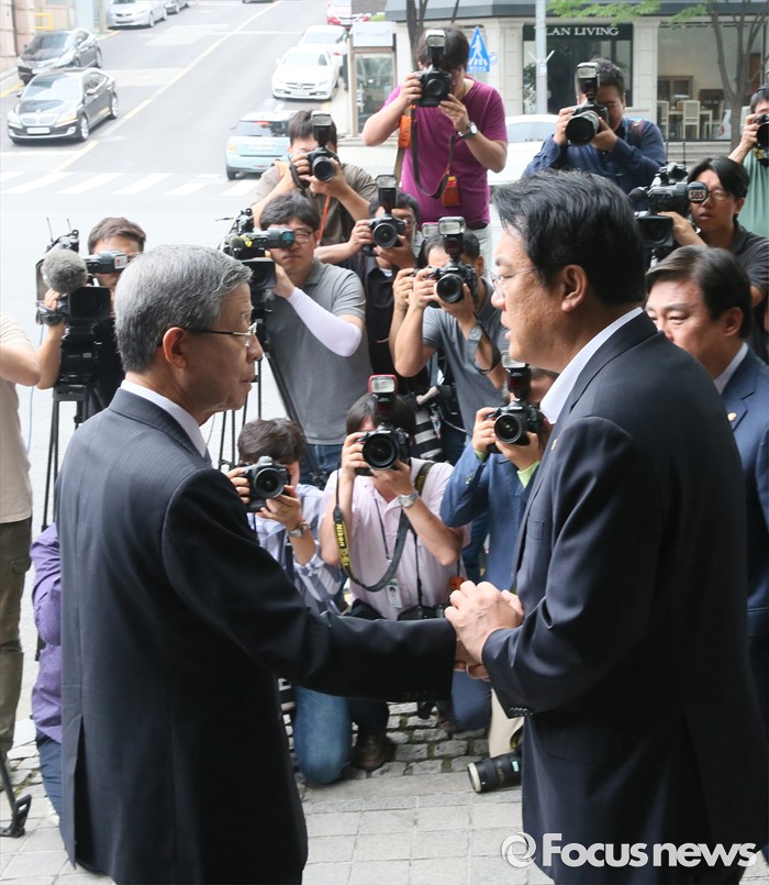 (서울=포커스뉴스) 김희옥(왼쪽) 새누리당 혁신비상대책위원장과 정진석 원내대표가 19일 오전 서울 강남구 논현동 한 카페에서 비상대책위원회 정상화를 위한 회동을 마치고 인사를 나누고 있다. 이번 회동은 지난 16일 탈당 무소속 의원들의 일괄복당을 결정한 혁신비대위 회의 과정에 불만을 제기하고 김 위원장이 칩거에 들어간지 나흘째 전격적으로 이뤄진 회동이다.