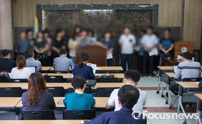 (안산=포커스뉴스) 19일 오전 경기도 안산시 안산교육지원청에서 단원고 재학생 학부모들의 세월호 희생자 존치교실 대안을 촉구하는 기자회견이 열리고 있다. 사진은 학부모들의 요청으로 모자이크 처리 되었다