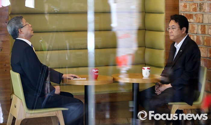 (서울=포커스뉴스) 김희옥 새누리당 혁신비상대책위원장과 정진석 원내대표가 19일 오전 서울 강남구 논현동 한 카페에서 비상대책위원회 정상화를 위한 회동을 하고 있다. 이번 회동은 지난 16일 탈당 무소속 의원들의 일괄복당을 결정한 혁신비대위 회의 과정에 불만을 제기하고 김 위원장이 칩거에 들어간지 나흘째 전격적으로 이뤄진 회동이다.