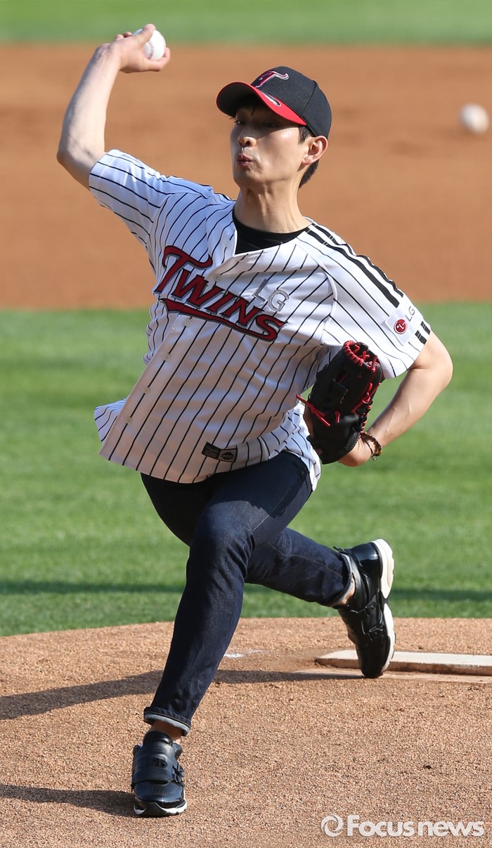 (서울=포커스뉴스) 19일 서울 잠실구장에서 열린 2016 프로야구 KIA-LG 경기에 앞서 배우 윤박이 시구하고 있다.