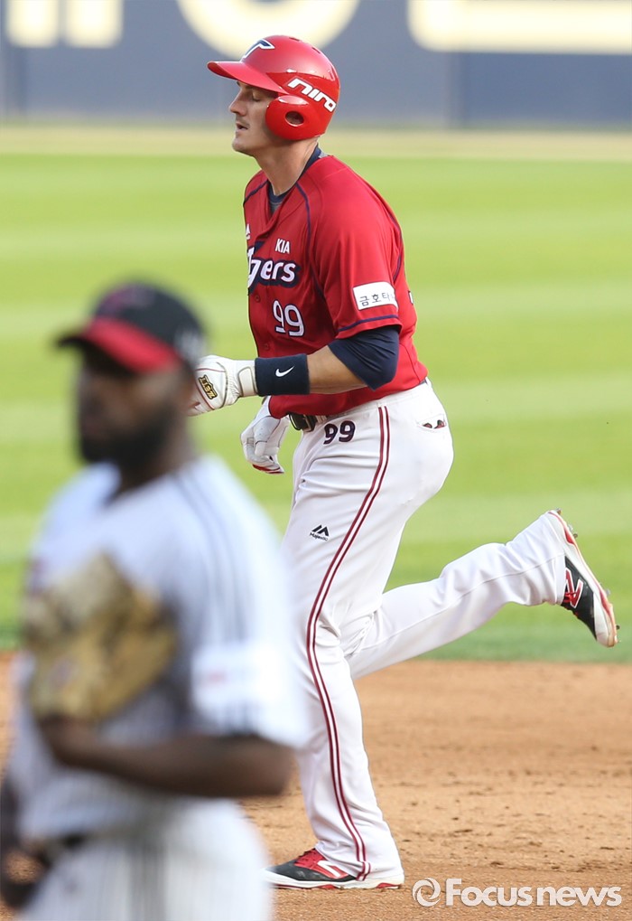 (서울=포커스뉴스) 19일 서울 잠실구장에서 열린 2016 프로야구 KIA-LG 경기 5회초 1사후 KIA 필이 좌월 솔로 홈런을 치고 베이스를 돌고 있다.