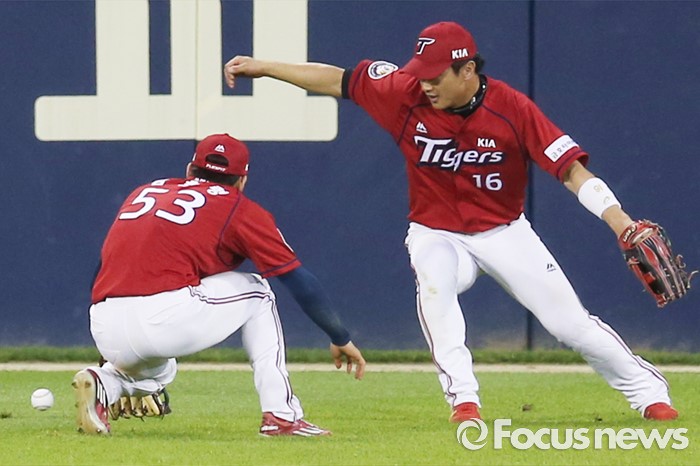 (서울=포커스뉴스) 19일 서울 잠실구장에서 열린 2016 프로야구 KIA-LG 경기 8회말 1사후 KIA 중견수 김호령(왼쪽)이 LG 정상호의 높이 뜬 타구를 놓쳐 2루타가 되고 있다. 오른쪽은 좌익수 김주찬.