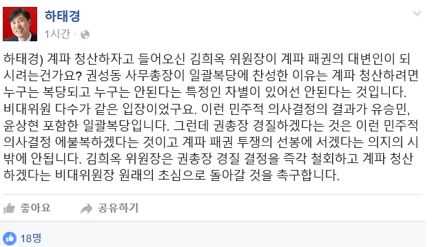 하 의원은 이를 비판하며 "김희옥 위원장은 권 총장 경질 결정을 즉각 철회하고 계파 청산을 하겠다는 비대위원장의 초심으로 돌아갈 것을 촉구한다"고 말했다.