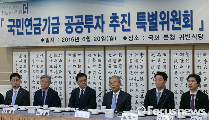 (서울=포커스뉴스) 20일 오전 서울 여의도 국회 귀빈식당에서 열린 더불어민주당 국민연금 공공투자 추진 특위 1차 회의에 참석한 김종인(오른쪽 세번째) 비대위 대표가 인사말을 하고 있다.