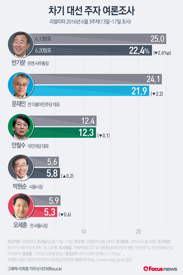 (서울=포커스뉴스) 여론조사 전문기관 리얼미터가 20일 발표한 6월 3주차 주간집계 여론조사 결과에 따르면 반기문 유엔 사무총장과 문재인 전 더불어민주당대표가 오차차범위내 접전을 벌이며 양강구도를 재확인했다.
