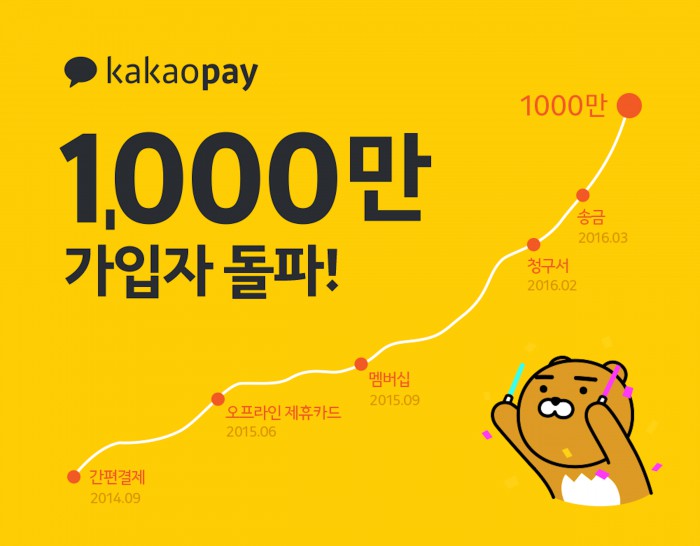 이는 2014년 9월 카카오페이 간편결제 서비스 출시 후 1년 9개월만의 성과다. 카카오페이는 카카오톡 기반인 동시에 국내 모든 신용카드를 지원하는 높은 편의성, 경쟁력 있는 인기 가맹점 1000개 이상 도입, 다양한 고객 할인 혜택 제공 등을 통해 가입 고객 수를 늘려왔다.