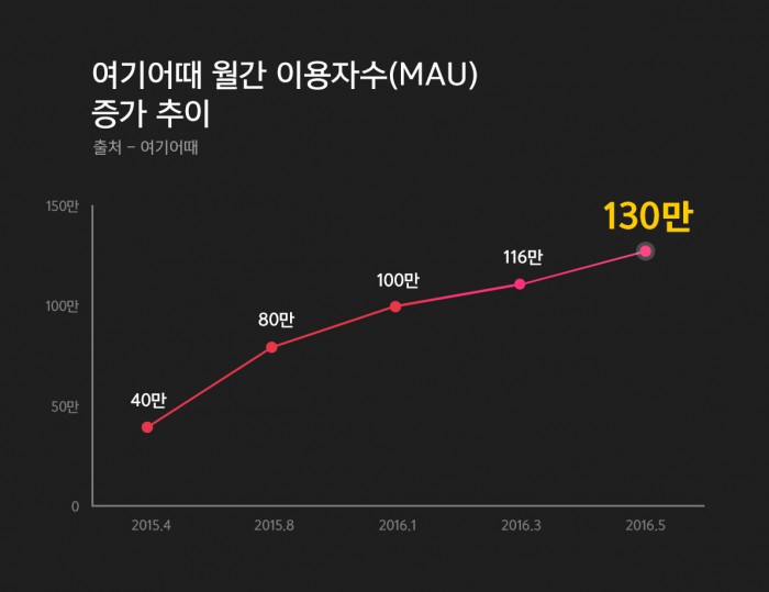 닐슨코리안클릭은 안드로이드 유저를 대상으로 매달 중소형호텔뿐 아니라 여행, 숙박과 관련한 모든 앱 중 이용자가 많은 앱을 집계해 발표한다. 여기어때는 지난 1월 69만9000명, 2월 76만4000명, 3월 68만1000명, 4월 68만명으로 가장 많은 사용자를 확보한 것으로 확인됐다.