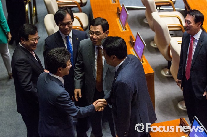 (서울=포커스뉴스) 정진석 새누리당 원내대표 및 유승민 새누리당 의원, 주호영 무소속 의원이20일 오전 서울 여의도 국회에서 열린 본회의에 참석해 인사 하고 있다.