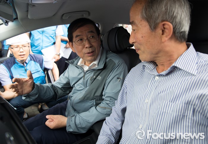 (서울=포커스뉴스) 박원순 서울시장이 20일 오전 서울역 인근 도로에서 택시에 탑승해 도로 함몰 실시간 신고시스템을 살펴보고 있다.