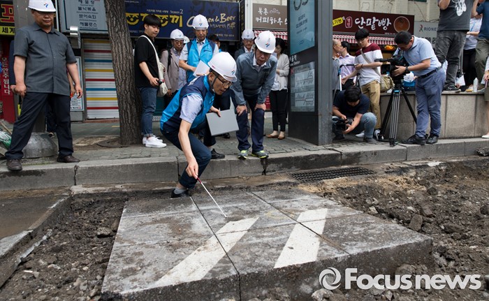 (서울=포커스뉴스) 박원순 서울시장이 20일 오전 서울역 인근 도로에서 동공 굴착 원인조사 및 복구과정을 점검하고 있다.
