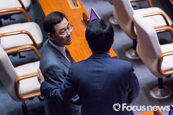 (서울=포커스뉴스) 정진석 새누리당 원내대표와 주호영 무소속 의원이 20일 오전 서울 여의도 국회에서 열린 본회의에 참석해 악수 하고 있다.