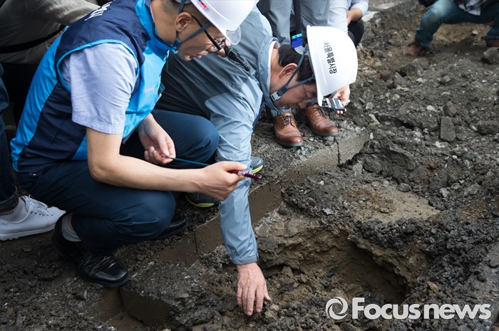 (서울=포커스뉴스) 박원순 서울시장이 20일 오전 서울역 인근 도로에서 동공 굴착 원인조사 및 복구과정을 점검하고 있다.